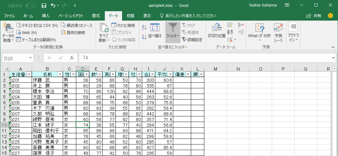 [データ]タブの[並べ替えとフィルター]グループの[フィルター]をクリックします。