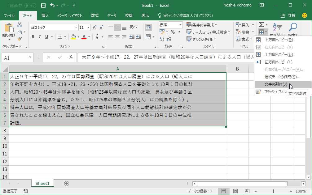 文字を複数のセルに割り付けるには