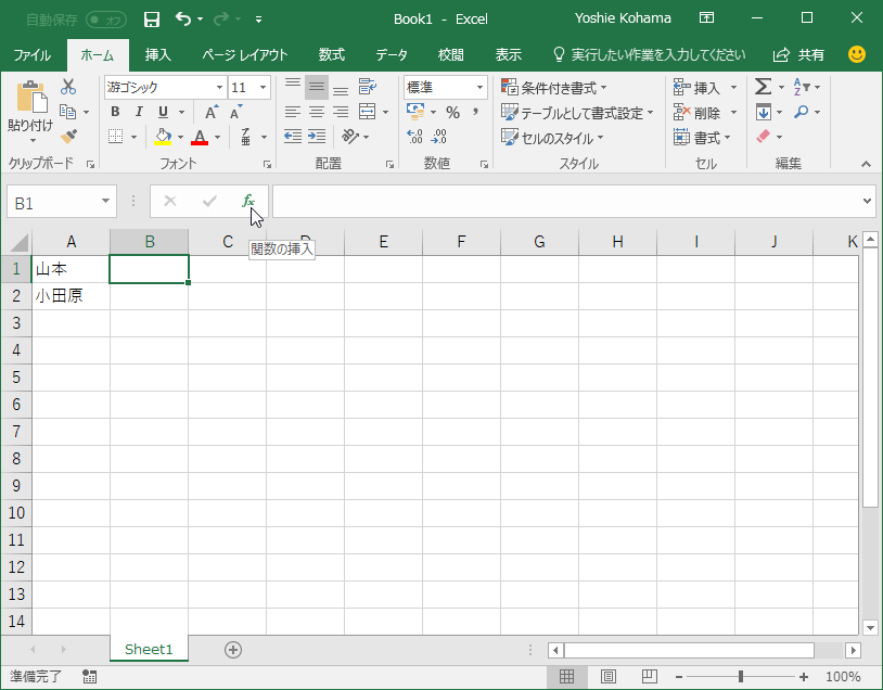 ここでは、リボンコマンドを使用せず、従来の数式バーの[関数の挿入]ボタンから操作してみましょう。