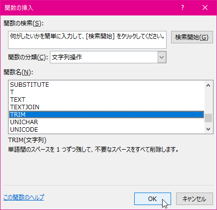 - 文字列操作関数のなかからTRIMを選択して[OK]ボタンをクリックします。