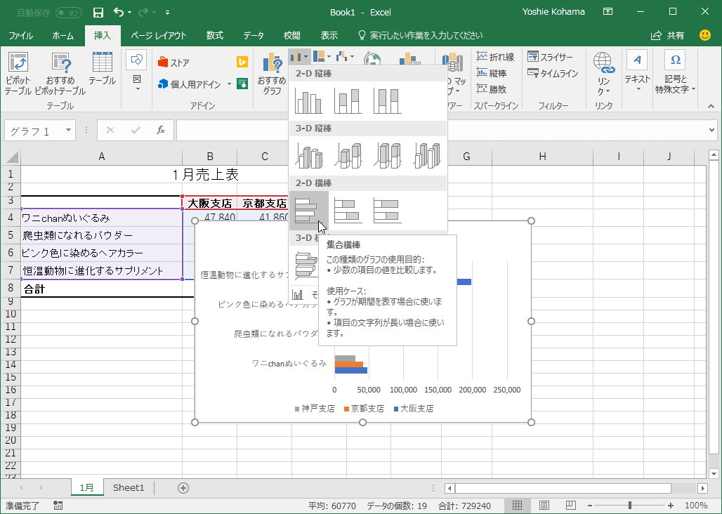 - 一覧から横棒グラフを選択します。ここでは、集合横棒を選択してみます。