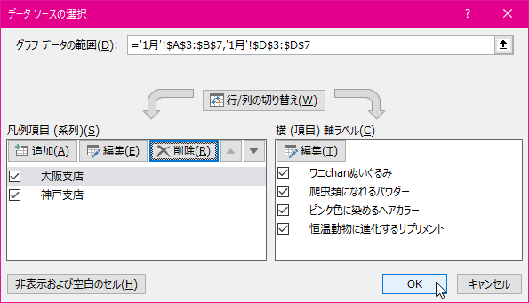 データ範囲(系列)を追加または削除するには