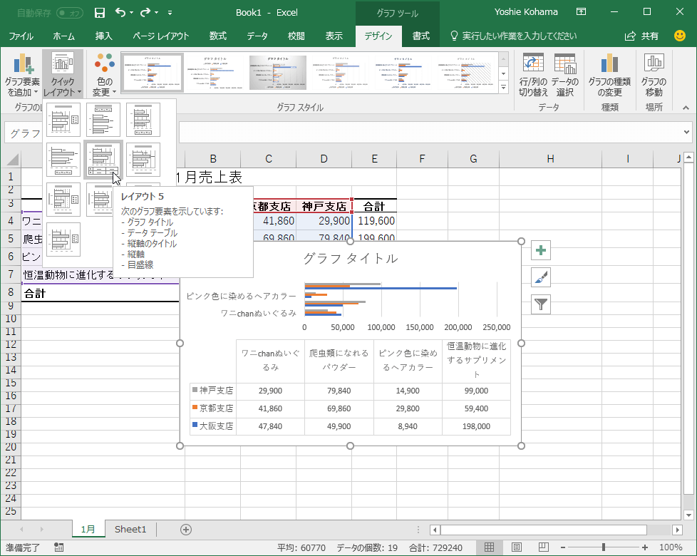 クイックレイアウトを使用すると、グラフのレイアウトを素早く変更できます。グラフのレイアウト全体を変更するには、グラフを選択して[グラフツール]の[デザイン]タブを開き、[クイックレイアウト]一覧よりレイアウトを選択します。