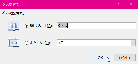 - [グラフの移動]ダイアログボックスよりグラフの配置先を選択して[OK]ボタンをクリックします。
