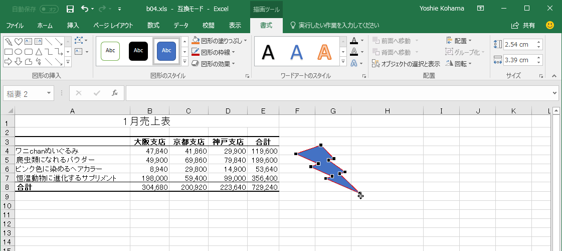 - 図形を選択し、[描画ツール]の[書式]タブを開き、[図形の挿入]グループの[図形の編集]をクリックします。
