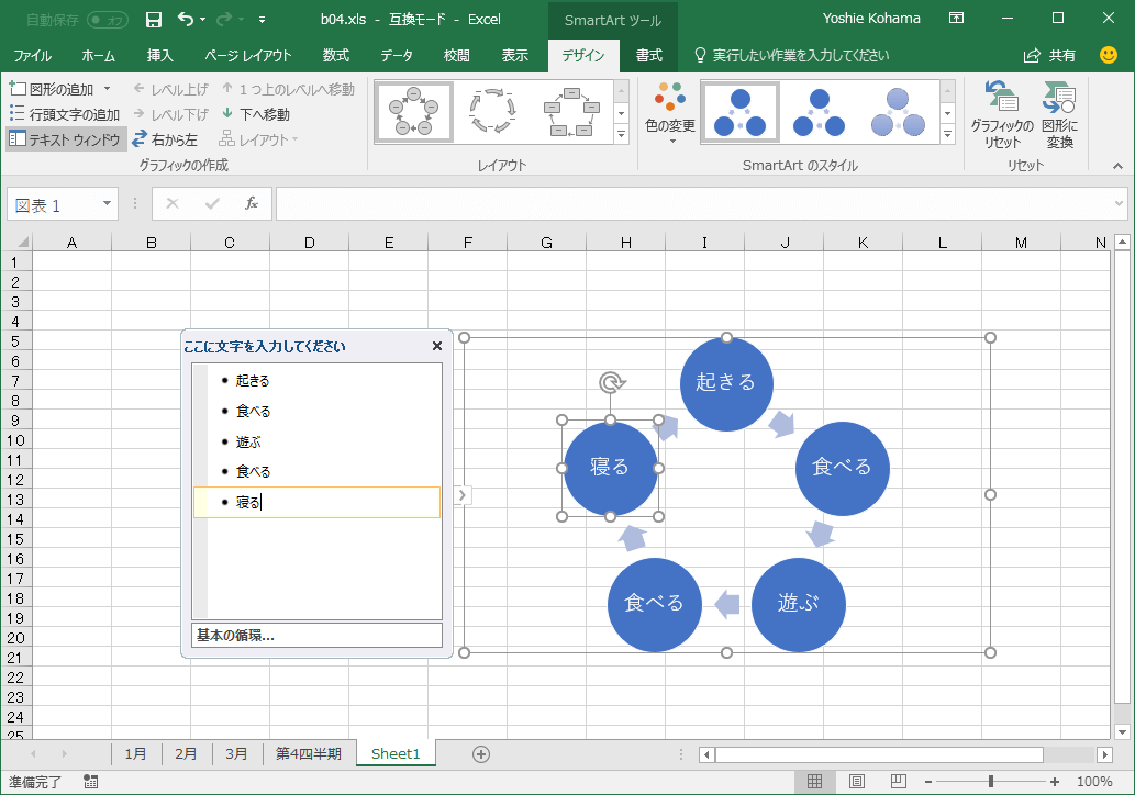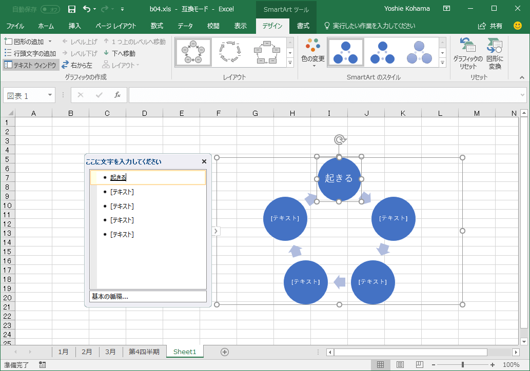 SmartArtのカスタマイズや操作方法については、基本的にWord と同じです。以下の記事を参照してください。