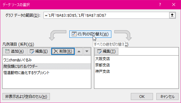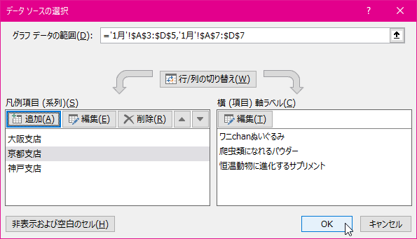 [行/列の切り替え]ボタンをクリックして行列入れ替えをもとに戻して[OK]ボタンをクリックします。