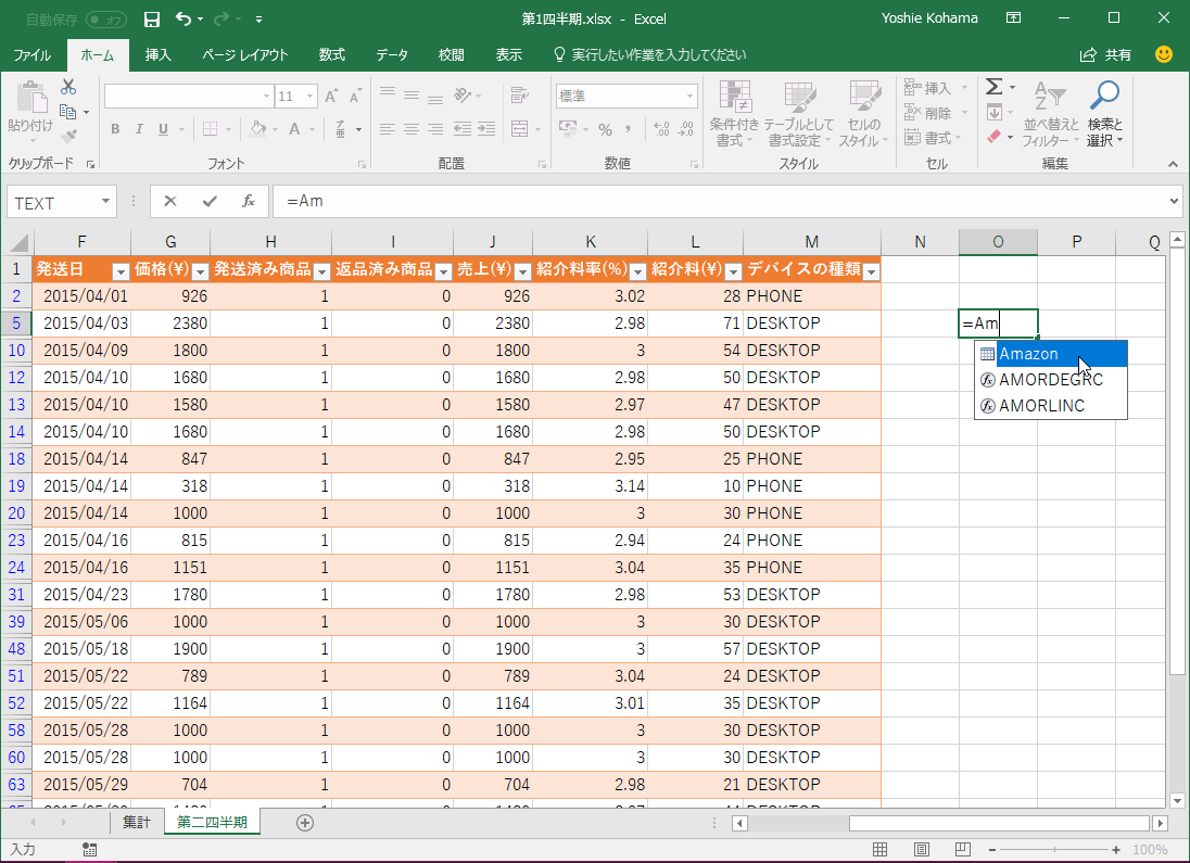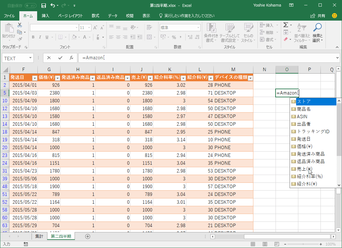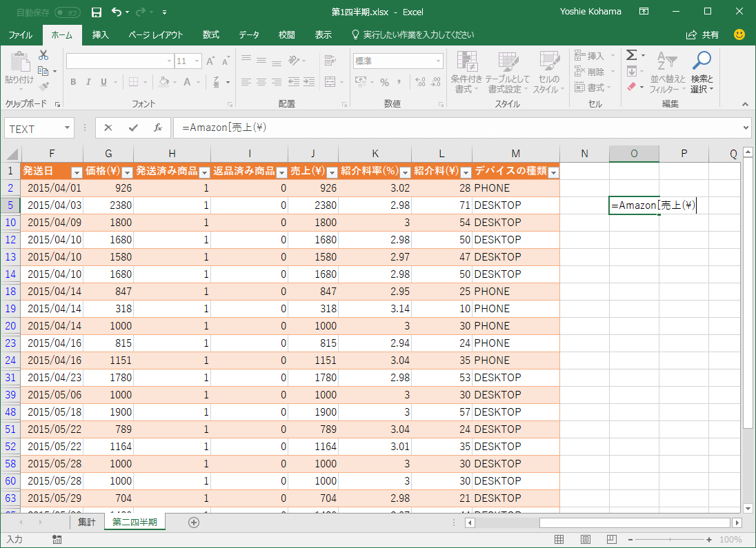 - 構造化参照が適用されて数式に表示されました。セル選択の場合は列見出しの前に@が付きます。