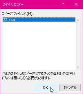 - [スタイルのコピー]ダイアログボックスからもう一方のブックを選択して[OK]ボタンをクリックします。