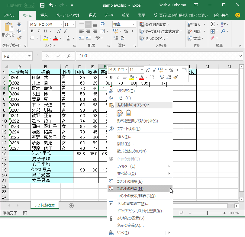 右クリックしてショートカットメニューより[コメントの削除]をクリックします。