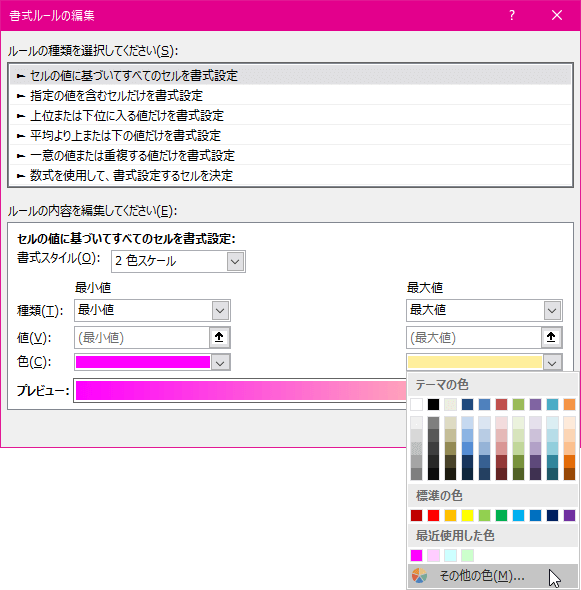 [書式ルールの編集]ダイアログボックスから変更したい要素を設定します。たとえば、最大値の色を変更したい場合は、下の図のように色を指定します。ここでは[その他の色]を選択します。