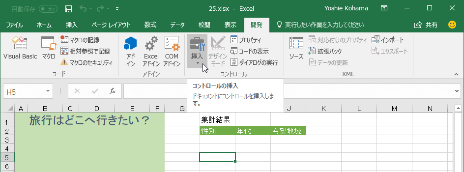 - [開発]タブの[コントロール]グループの[コントロールの挿入]をクリックします。
