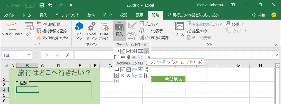 - [開発]タブの[コントロール]グループの[コントロールの挿入]一覧から[オプションボタン]を選択します。