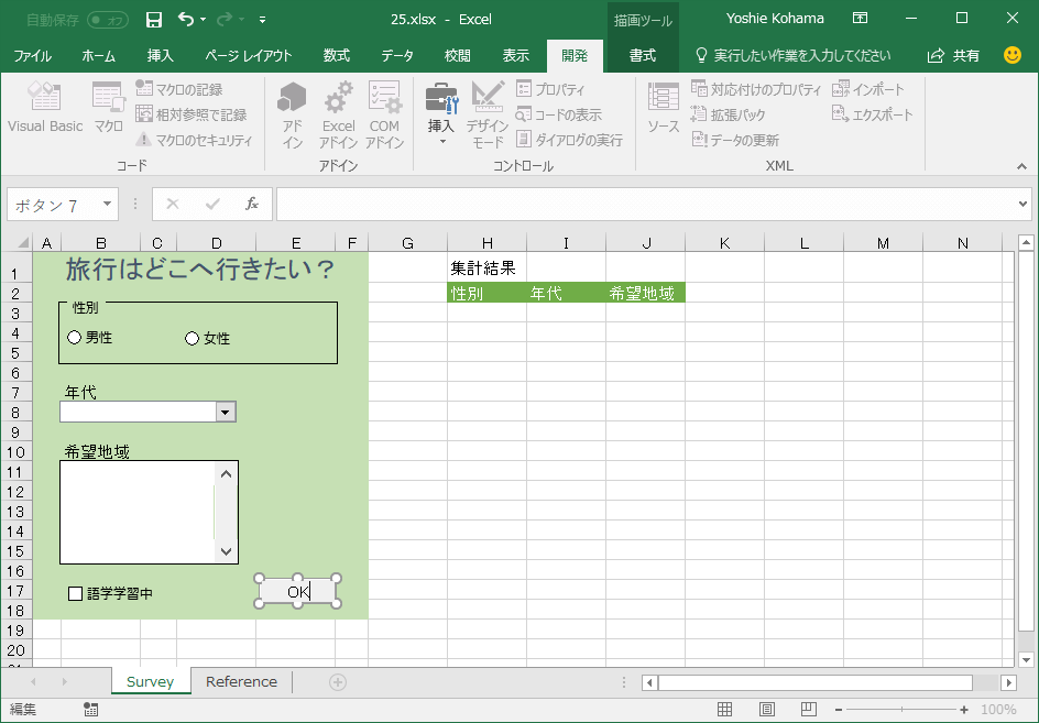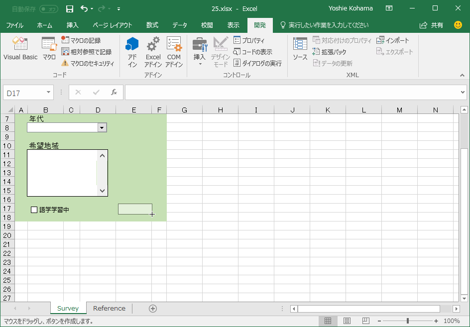 - [開発]タブの[コントロール]グループの[コントロールの挿入]一覧からボタンを挿入します。