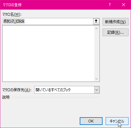 - マクロの登録画面が表示されますが、ここでは[キャンセル]ボタンをクリックします。