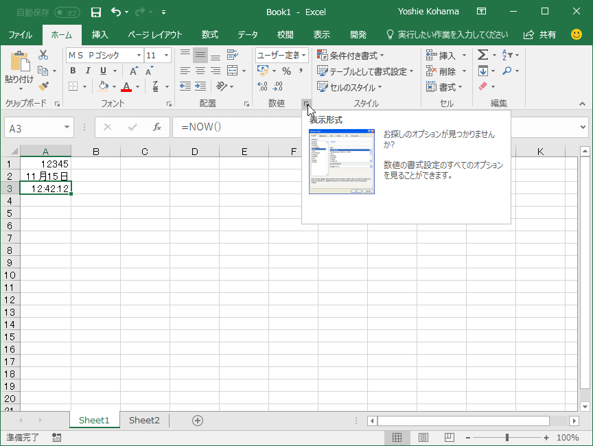 時刻が入ったセルを選択し、[ホーム]タブの[数値]グループ右下のダイアログボックス起動ツールをクリックします。