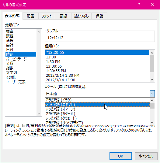 時刻セルを選択し、[ホーム]タブの[数値]グループ右下のダイアログボックス起動ツールをクリックして、[セルの書式設定]ダイアログボックスの[表示形式]タブで[時刻]を選択し、[ロケール(国または地域)]一覧から対象となる国または地域を選択して、一覧から表示形式を選択します。