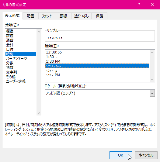 - [セルの書式設定]ダイアログボックスの[表示形式]タブで、[時刻]を選択します。
