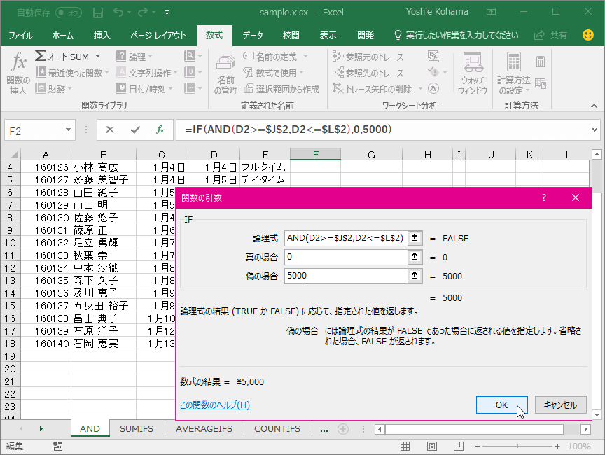 - [真の場合]には「0」、[偽の場合]には「5000」と入力して[OK]ボタンをクリックします。
