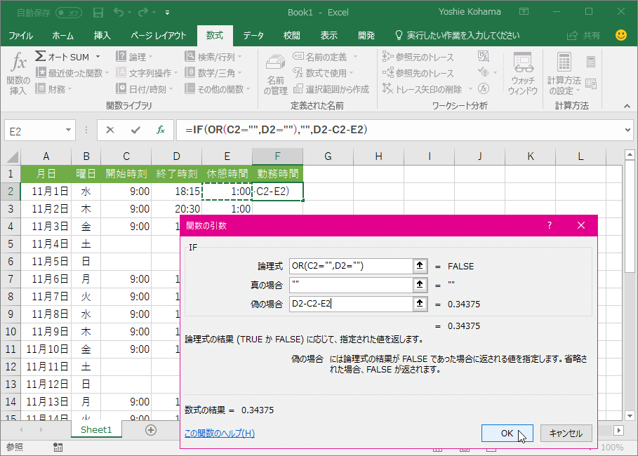 ここでは、開始時刻または終了時刻にデータが入っていない場合は空白、それ以外は計算するように数式を作成してみましょう。