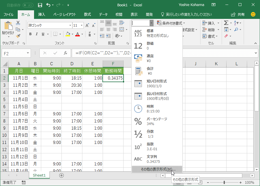 - 勤務時間がシリアル値で求められました。時間表示にするために、[その他の表示形式]を選択します。