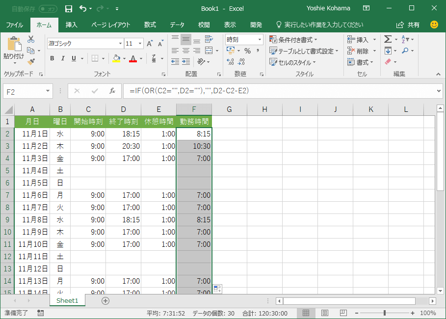 - 勤務時間のセルを選択します。
