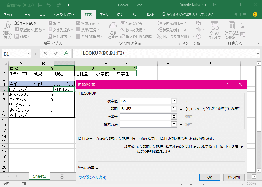 - 求めたいセルをクリックし、[数式]タブの[検索/行列]をクリックして、一覧から「HLOOKUP」を選択します。