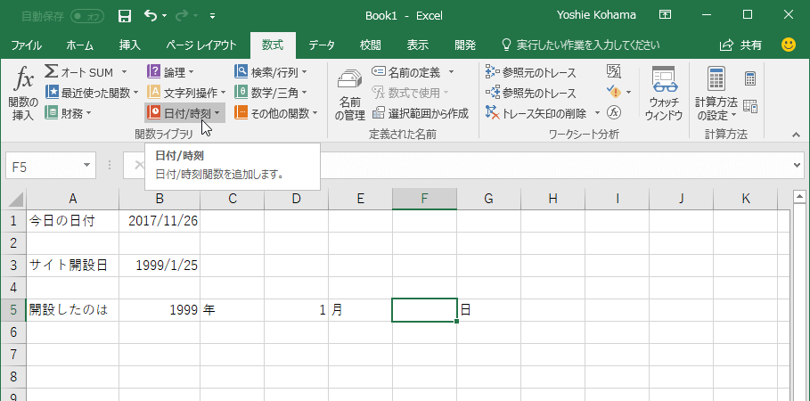- 日を求めたいセルを選択して、[数式]タブの[関数ライブラリ]一覧から[日付/時刻]をクリックします。
