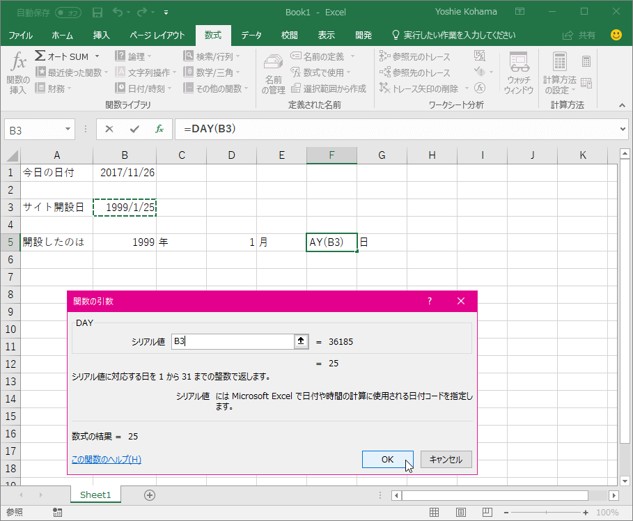 - 引数には日付が入ったセルを選択して[OK]ボタンをクリックします。