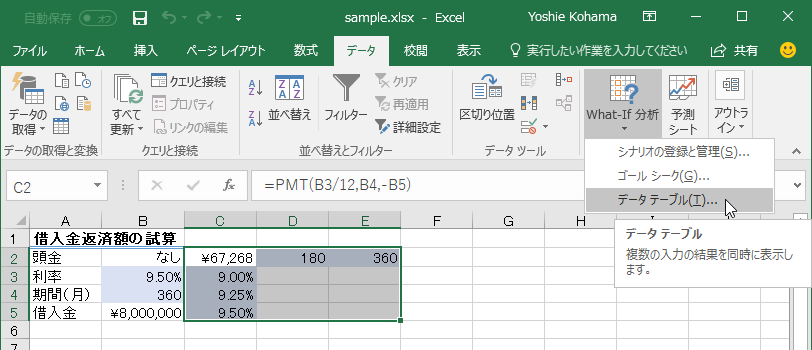 =PMT(B3/12,B4,-B5)を入力し、利率と支払期間の変数を入力しておきます。 - データテーブルの範囲、C2:E5