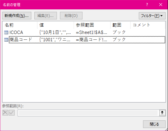- [名前の管理]ダイアログボックスの[フィルター]一覧から[テーブル名]を選択します。