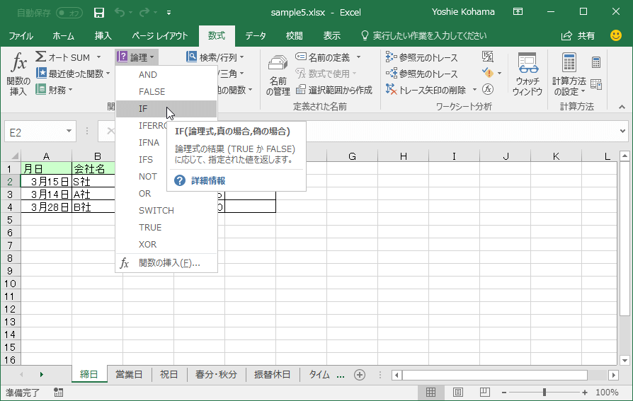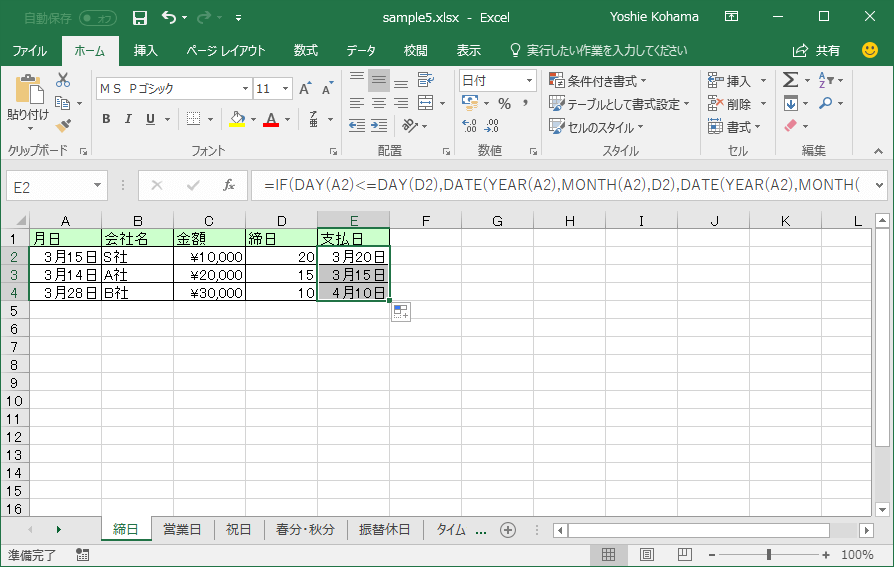 - サンプルファイルの一番左側の「締日」シートを開き、締日を求めたいセル(E2)を選択します。