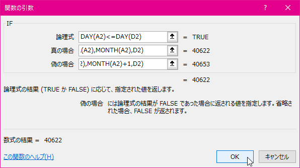 - 真の場合:DATE(YEAR(A2),MONTH(A2),D2)