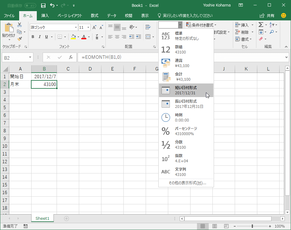 - シリアル値が返されるので、[ホーム]タブを開き、[数値]カテゴリの[標準]の▼をクリックして日付形式を選択します。