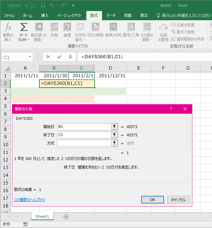 - 求めたいセルを選択して、[数式]タブの[日付と時刻]一覧より[DAYS360]を選択します。