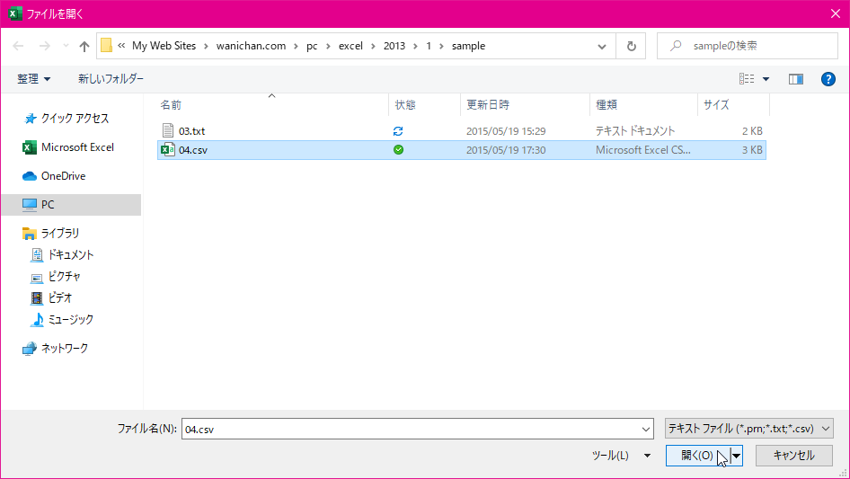 - ファイルを選択して[開く]ボタンをクリックします。