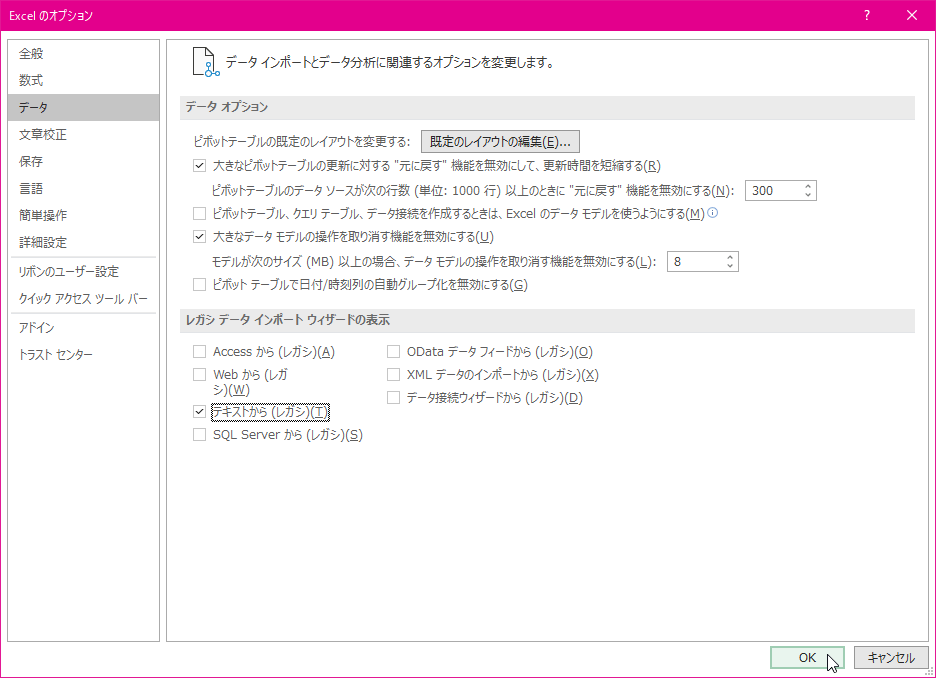 - [レガシ データ インポート ウィザードの表示]オプションで[テキストから(レガシ)]にチェックを付けて[OK]ボタンをクリックします。