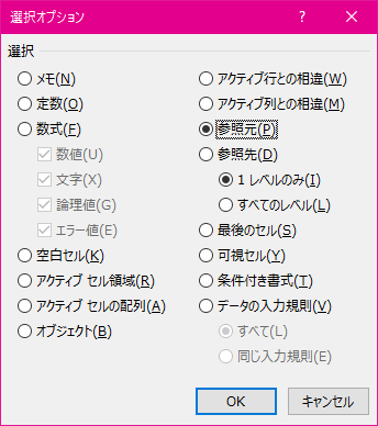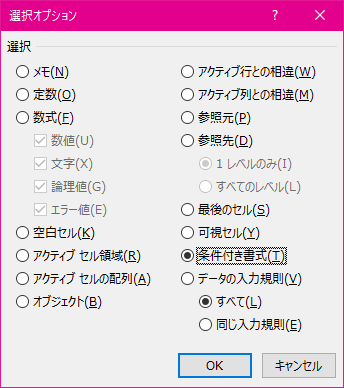 コメント、数式が入ったセル、最後のセル等に移動するには、ジャンプ機能の[セル選択]オプションで一覧から選びます。
