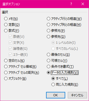 現在選択されているセルと同じデータの入力規則が適用されているセルを検索するには、[同じ入力規則] をクリックします。