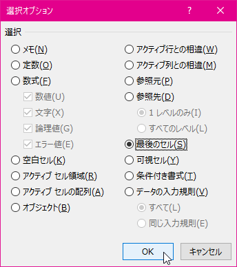 - [最後のセル]を選択して[OK]ボタンをクリックします。