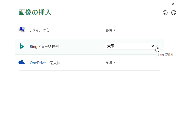 - 画像の場所を選択します。ここではBingイメージ検索ボックスにキーワードを入れて検索してみましょう。
