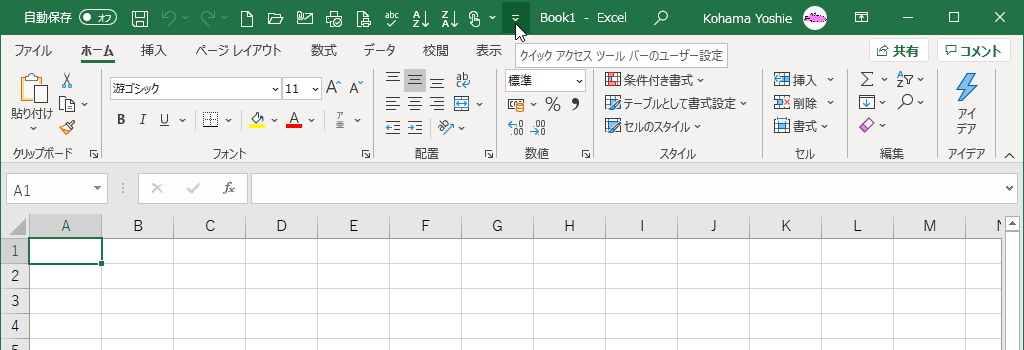 クイックアクセスツールバーは既定ではタイトルバーの左側に配置されていますが、リボンの下に移動することもできます。クイックアクセスツールバーの右側▼をクリックし、クイックアクセスツールバーのカスタマイズメニューより[リボンの下に表示]を選択します。クイックアクセスツールバーを移動できるのはWindows版のみで、Mac版ではサポートされていません。