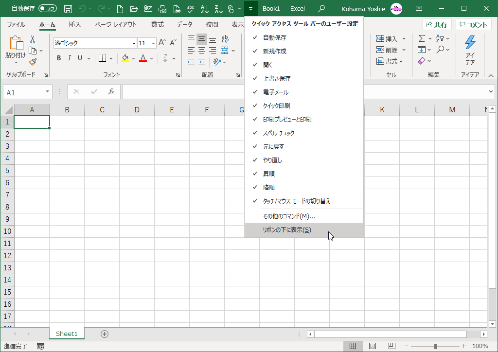 - クイックアクセスツールバーのカスタマイズメニューより[リボンの下に表示]を選択します。