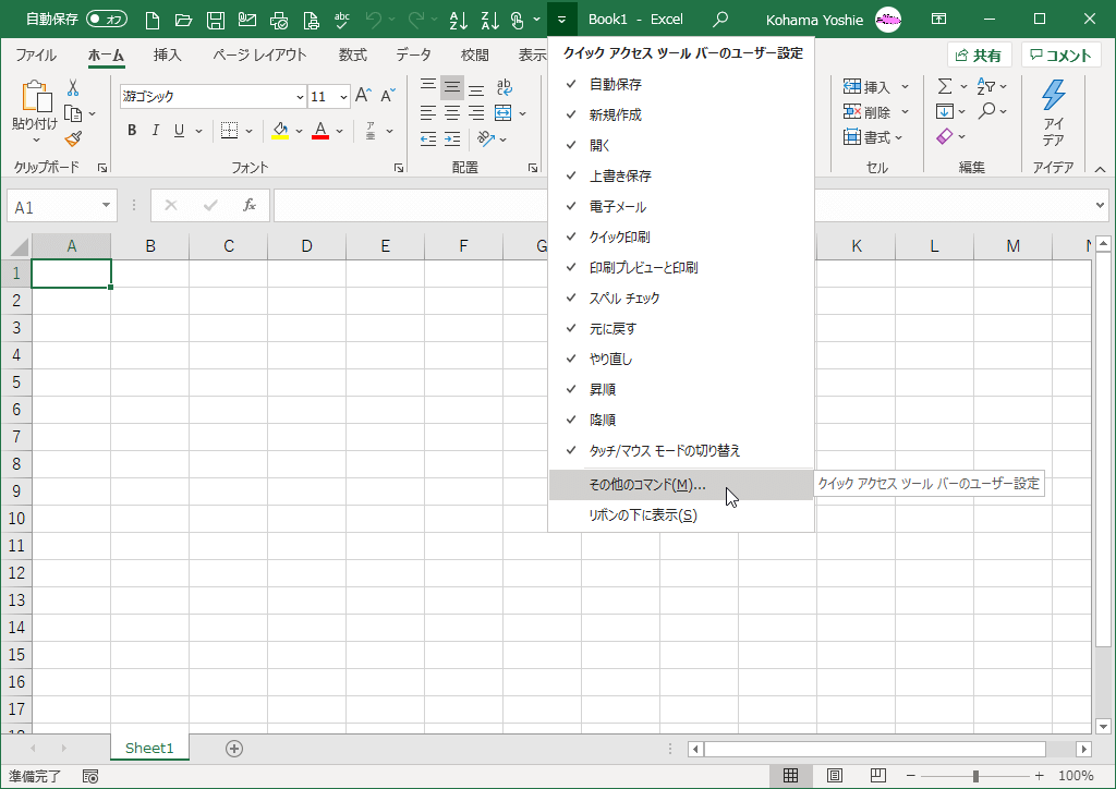 - クイックアクセスツールバーのカスタマイズメニューより[その他のコマンド]を選択します。