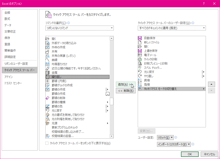 一覧にないコマンドをクイックアクセスツールバーに追加する