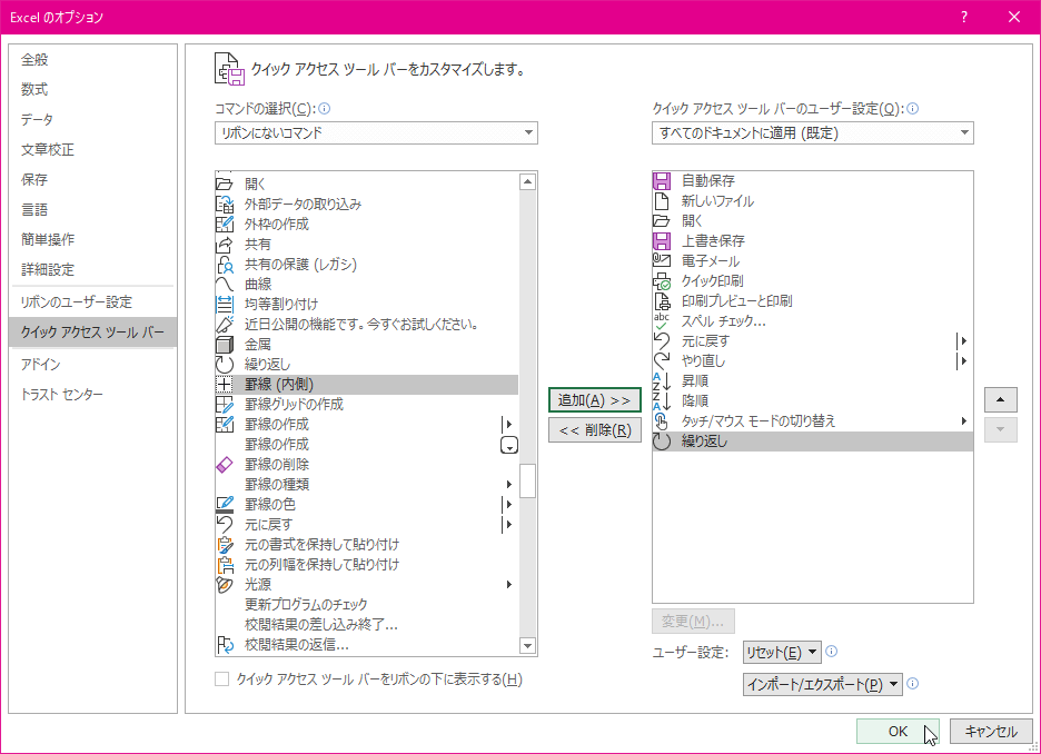 - コマンドがクイックアクセスツールバーに登録されました。