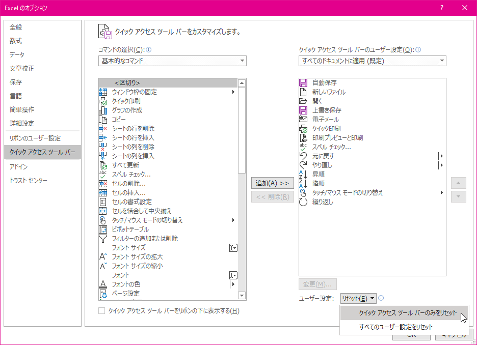 - [クイックアクセスツールバーのみをリセット]をクリックします。