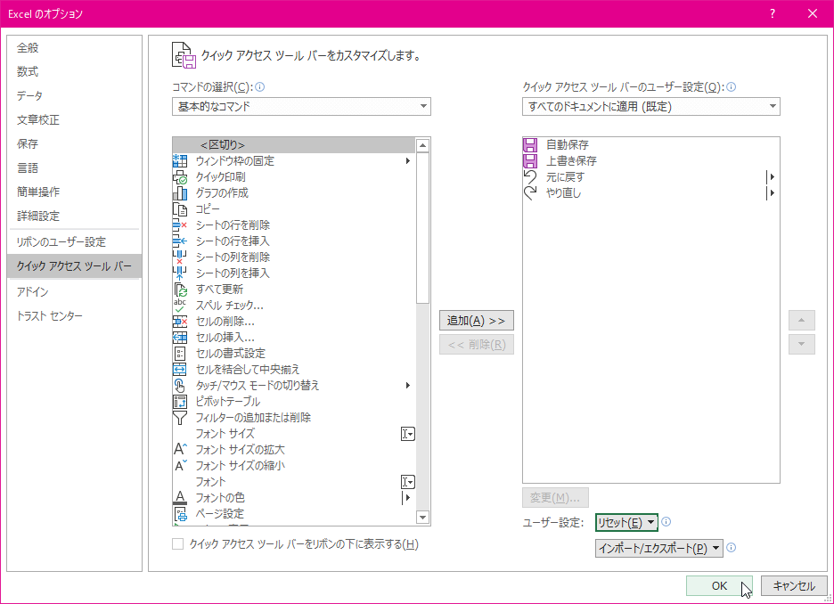- クイックアクセスツールバーがリセットされたら[OK]ボタンをクリックします。