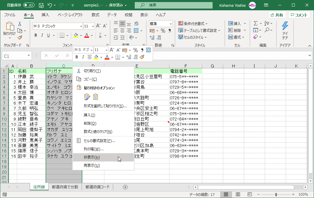 - ワークシートで、ユーザー設定ビューに保存する表示および印刷設定を変更しておきます。