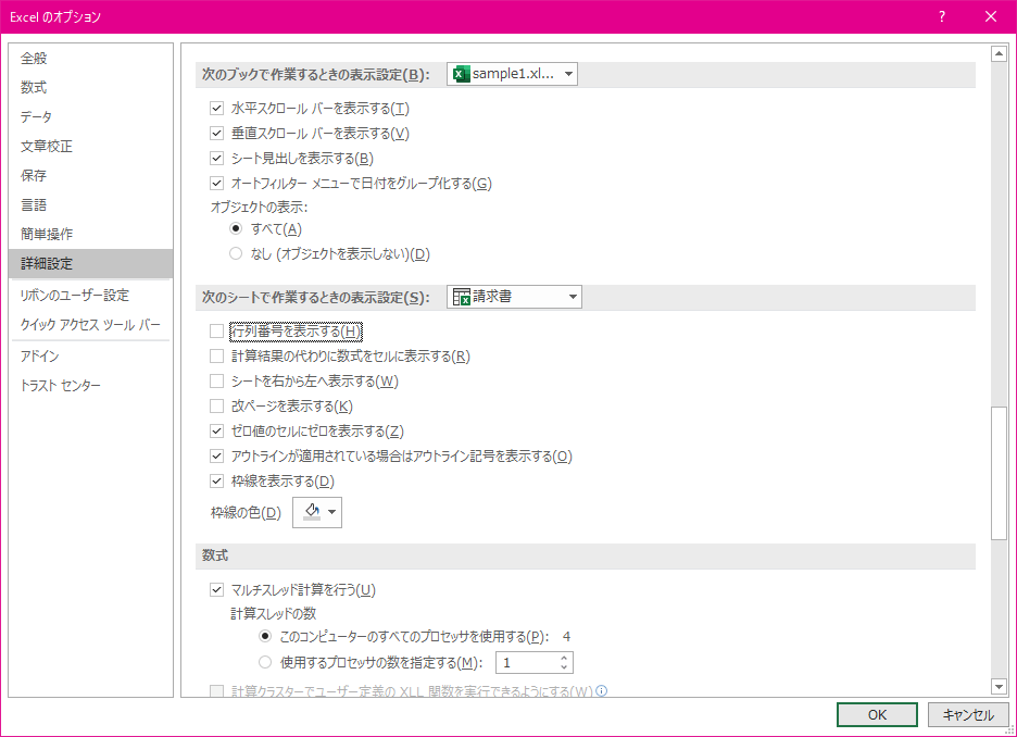 - [次のシートで作業するときの表示設定]オプションで、[行列番号を表示する]にのチェックを外し、[OK]ボタンをクリックします。